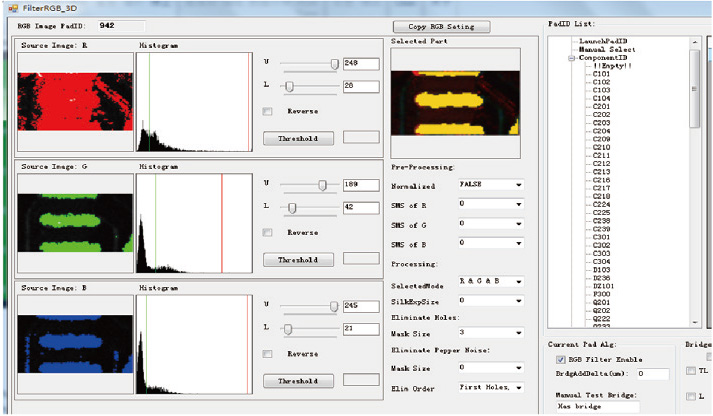 專利的RGB Tune功能通過單獨拍攝紅綠藍三原色照片并結(jié)合獨特的顏色過濾算法,完美的解決橋接誤判和相對基準面不確定的問題,并同時提供2D/3D測量 結(jié)果和彩色的錫膏圖片,配合2D光源有效避免錫膏因紅光角度問題導致的RGB彩色效果失真;不同基板顏色的RGB調(diào)試通用性更強大幅度提升設(shè)備的(高度, 體積,面積)重復性精度。